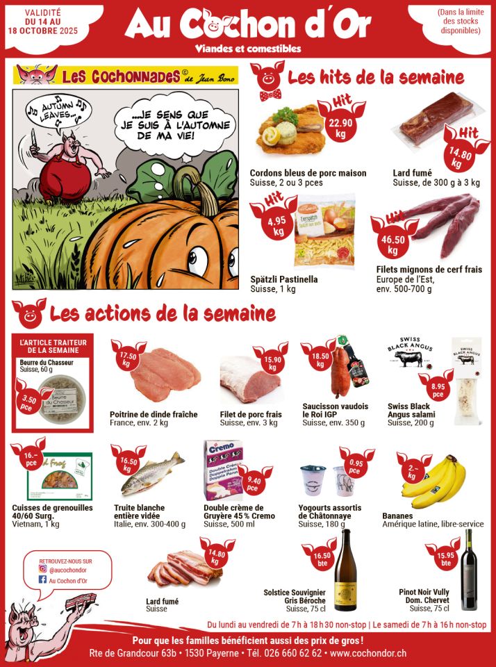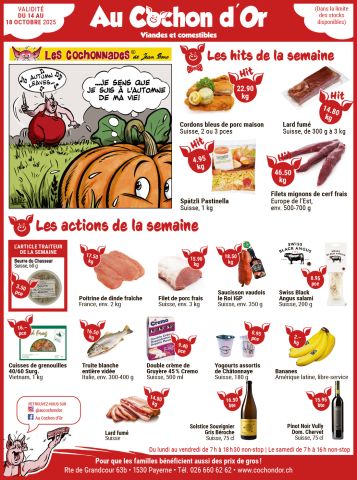 Ouvert à tous, le Cochon d'Or à la Route de Grandcour à Payerne vous offre un service de qualité. Boucherie, épicerie, fruits et légumes, cave ou encore traiteur à l'emporter, de tout pour tous !